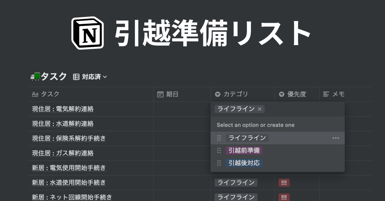自分は計画を立てないと実行に移せないタイプなので、Notionというアプリを利用して引っ越し準備リストを作成しました。